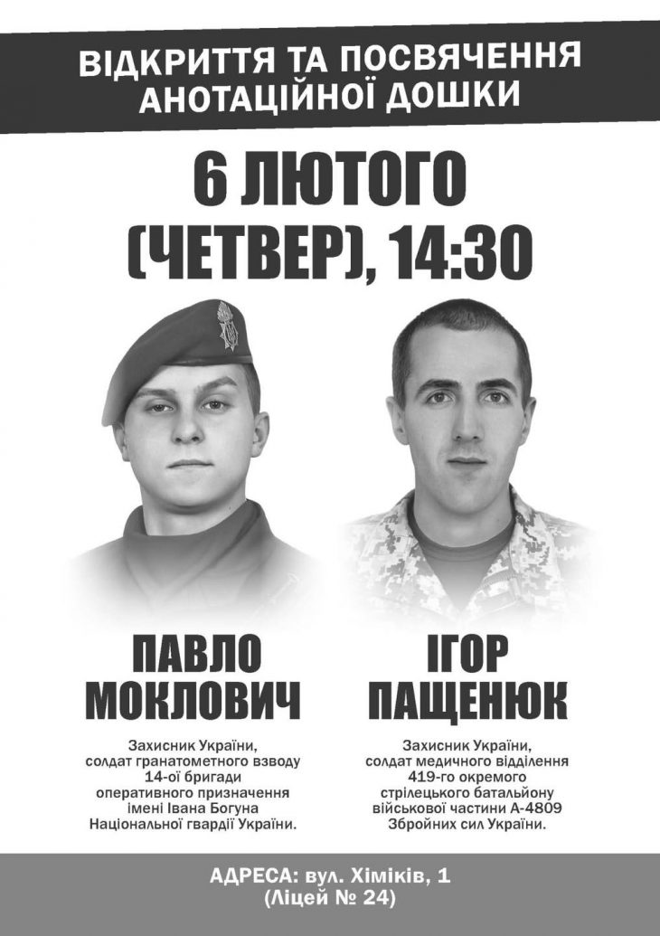 В четвер, 6 лютого, відкриють дві анотаційні дошки полеглим захисникам Павлу Мокловичу та Ігорю Пащенюку. Пише Голос-Інфо з посиланням на Руслана Марцінківа Пам’ятні знаки освятимо на фасаді Ліцею №24 (вул. […]