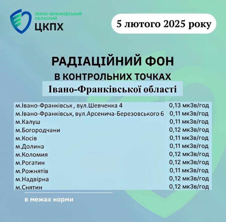Станом на ранок 05.02.2025 показник радіаційного фону в Івано-Франківській області становив від 0,11 мкЗв/год до 0,13 мкЗв/год, що не перевищує природний радіаційний фон для Прикарпаття (в межах 0,32 мкЗв/год). Пише […]