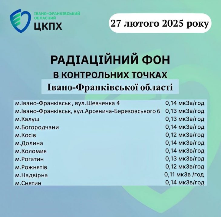 Станом на ранок 27.02.2025 показники радіаційного фону в Івано-Франківській області становлять від 0,11 мкЗв/год до 0,17 мкЗв/год (враховуючи допустиму похибку), що не перевищує природний радіаційний фон характерний для Прикарпаття (0,32 […]