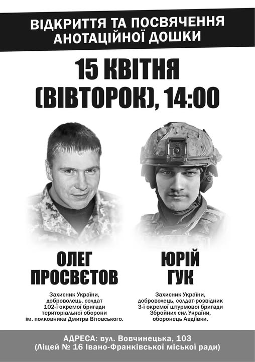 У вівторок, 15 квітня у Ліцей 16 Івано-Франківської міської ради відбудеться відкриття двох пам’ятних дощок загиблим Захисникам України. Пише Голос-Інфо, посилаючись на Івано-Франківську міську раду. Олегу Просвєтову – добровольцю, солдату […]