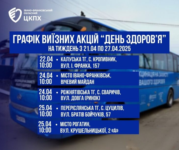 Графік виїзних акцій «День здоров’я» на тиждень з 21.04 по 27.04.2025 року