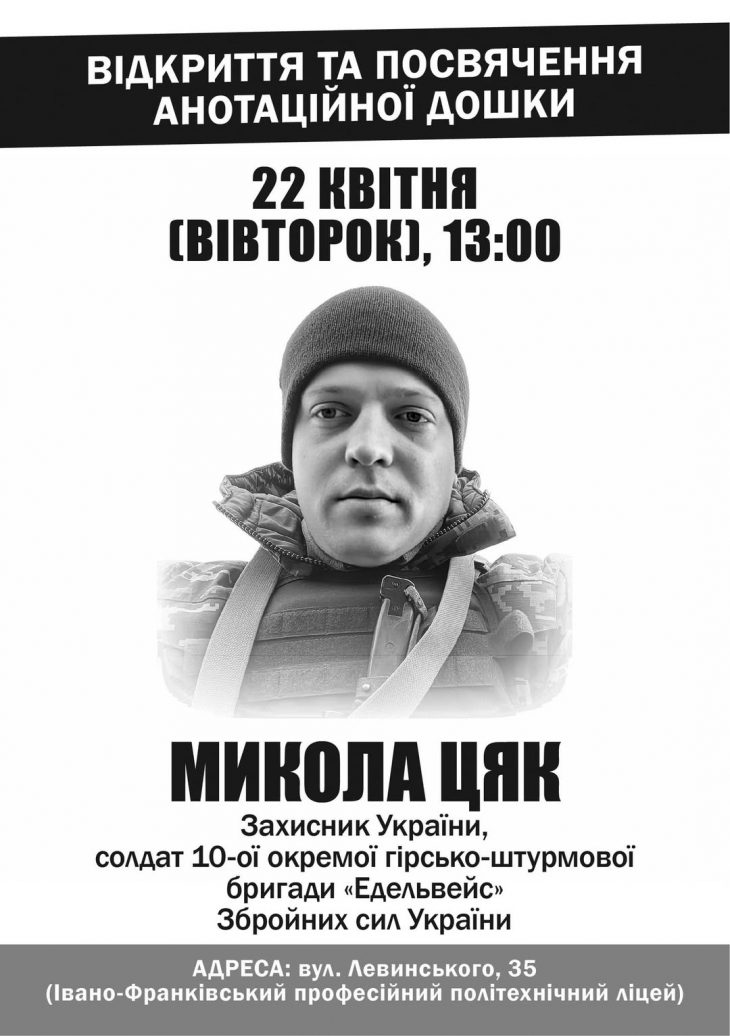 Завтра, 22 квітня в Івано-Франківську вшануємо пам’ять загиблого Героя України Миколу Цяка. Пише Голос-Інфо з посиланням на Івано-Франківську міську раду Пам’ятну дошку буде встановлено на фасаді Івано-Франківського професійного політехнічного ліцею […]