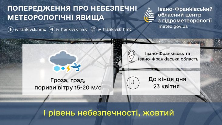 До кінця дня 23 квітня по місту Івано-Франківську та області грози, град (6-19 мм), пориви вітру 15-20 м/с. Пише Голос-Інфо з посиланням на Івано-Франківський обласний центр з гідрометеорології ( 1 […]