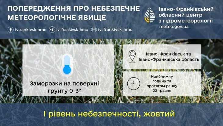 В найближчу годину та протягом ранку 02 травня заморозки на поверхні грунту 0-3°. Пише Голос-Інфо з посиланням на Івано-Франківський обласний центр з гідрометеорології (1 рівень небезпечності, жовтий). Стежте за нами […]