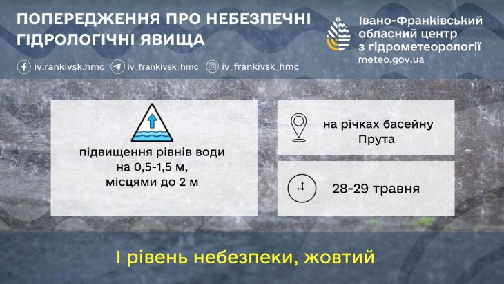 У зв’язку з очікуваними значними опадами на річках басейну Прута протягом 28- 29 травня очікуються підйоми рівнів води на 0,5 – 1,5 м, на окремих ділянках до 2,0 м над […]