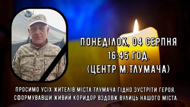 Прохання усіх жителів Тлумача гідно зустріти Героя, сформувавши живий коридор вздовж вулиць нашого міста. Пише Голос-Інфо з посиланням на Тлумацьку міську раду. Орієнтовний час прибуття – 16:45 год. (центр міста, […]