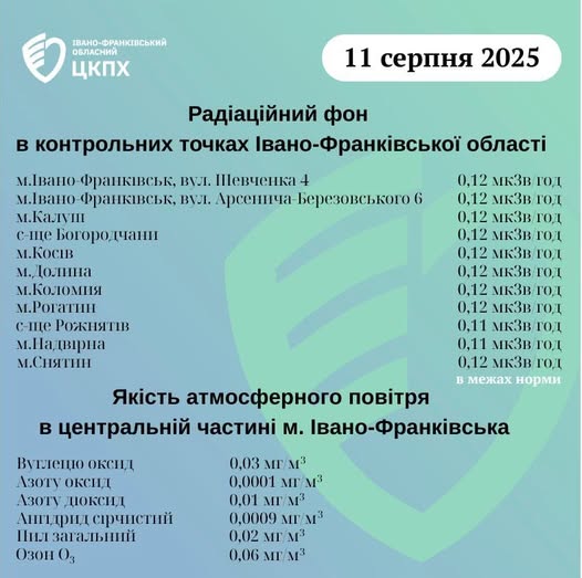 Станом на ранок 11.08.2025 показники радіаційного фону в Івано-Франківській області становлять від 0,11 мкЗв/год до 0,12 мкЗв/год, що не перевищує природний радіаційний фон характерний для Прикарпаття (0,32 мкЗв/год). Пише Голос-Інфо, […]
