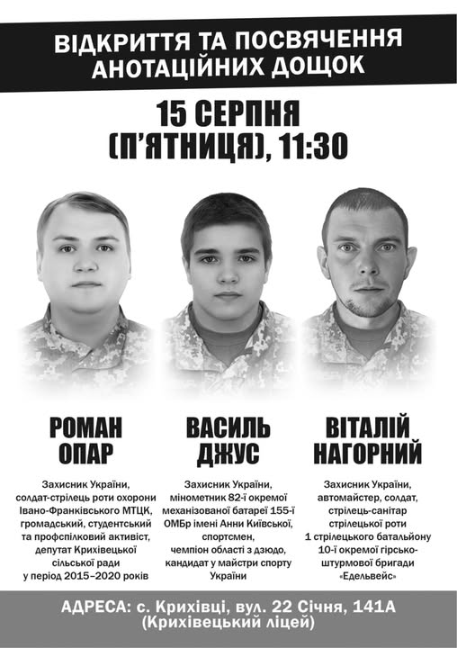 Відбудеться відкриття анотаційних дощок на фасаді Крихівецького ліцею Українським Героям: Роману Опару, Василю Джусу та Віталію Нагорному
