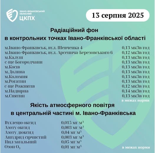 Станом на ранок 13.08.2025 показники радіаційного фону в Івано-Франківській області становлять від 0,12 мкЗв/год до 0,14 мкЗв/год, що не перевищує природний радіаційний фон характерний для Прикарпаття (0,32 мкЗв/год). Пише Голос-Інфо, […]
