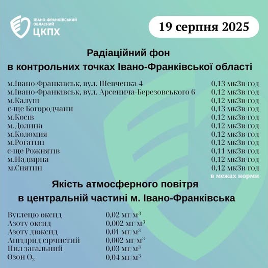 Станом на ранок 19.08.2025 показники радіаційного фону в Івано-Франківській області становлять від 0,11 мкЗв/год до 0,13 мкЗв/год, що не перевищує природний радіаційний фон характерний для Прикарпаття (0,32 мкЗв/год). Пише Голос-Інфо, […]