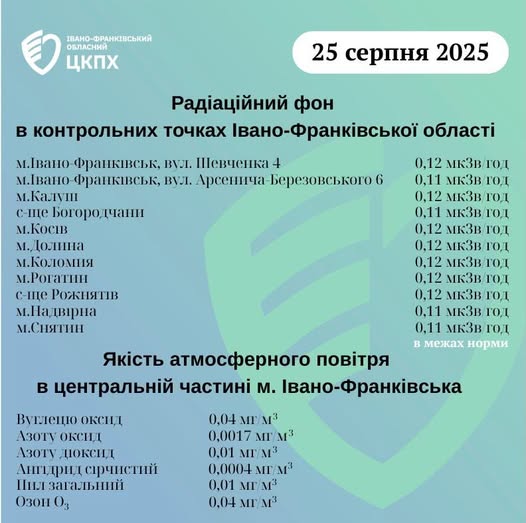 Станом на ранок 25.08.2025 показники радіаційного фону в Івано-Франківській області становлять від 0,11 мкЗв/год до 0,12 мкЗв/год, що не перевищує природний радіаційний фон характерний для Прикарпаття (0,32 мкЗв/год). Пише Голос-Інфо, […]