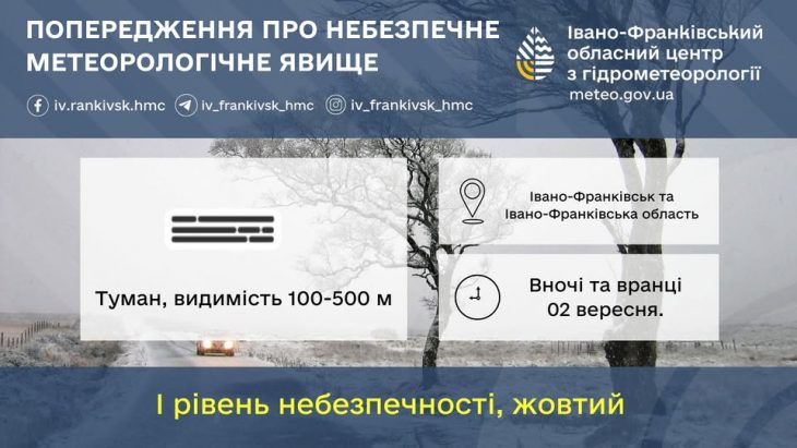 За даними синоптиків, вночі та вранці 2 вересня по Івано-Франківську та області очікується туман. Інформує Голос-Інфо, посилаючись на Івано-Франківський обласний центр з гідрометеорології Видимість становитиме 100-500 метрів, що відповідає першому […]