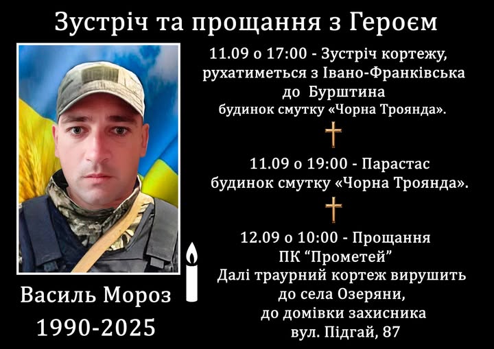 11 вересня, о 17:00 до Бурштина прибуде кортеж із тілом загиблого захисника Василя Мороза. Кортеж рухатиметься дорогою Н-09 з Івано-Франківська до будинку скорботи «Чорна Троянда», де о 19:00 відбудеться парастас. […]