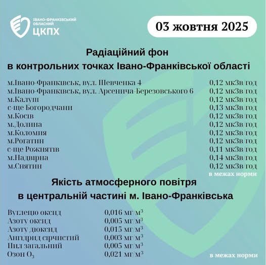 Станом на ранок 03 жовтня 2025 року показники радіаційного фону в Івано-Франківській області знаходяться у межах від 0,11 мкЗв/год до 0,14 мкЗв/год. Пише Голос-Інфо, посилаючись на Івано-Франківський обласний центр контролю та профілактики […]