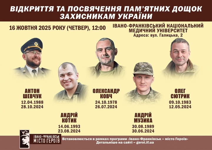 Завтра, у четвер, 16 жовтня, о 12:00 год в Івано-Франківську відбудеться пам’ятний захід, присвячений вшануванню ще п’ятьох медиків, випускників Івано-Франківського національного медичного університету (ІФНМУ), які загинули, захищаючи Україну. Пише Голос-Інфо, […]