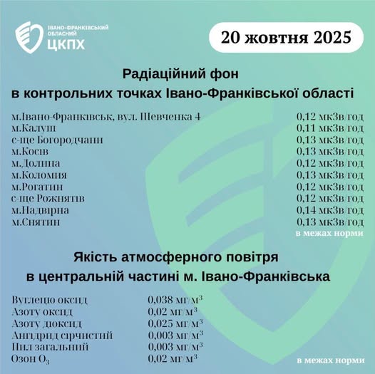 Станом на ранок 20 жовтня 2025 року показники радіаційного фону в Івано-Франківській області та якість атмосферного повітря в обласному центрі знаходяться в межах норми. Пише Голос-Інфо, посилаючись на Івано-Франківський обласний […]