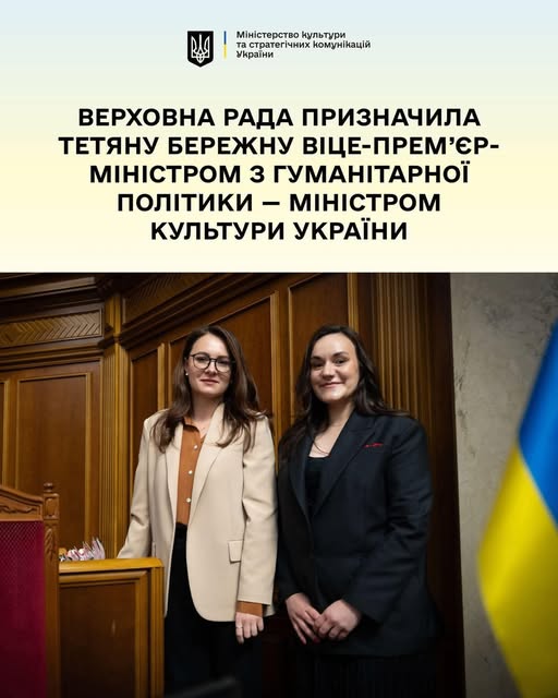 Тетяна Бережна — Віце-прем’єр-міністр з гуманітарної політики — Міністр культури України 21 жовтня Верховна Рада підтримала її призначення — 266 голосів “за”. Пише Голос-Інфо з посиланням на Управління культури, національностей […]