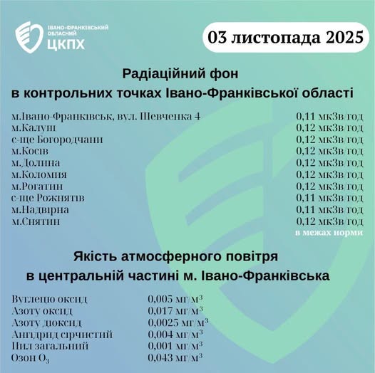 Станом на ранок 03.11.2025 показники радіаційного фону в Івано-Франківській області становлять від 0,11 мкЗв/год до 0,12 мкЗв/год, що не перевищує природний радіаційний фон характерний для Прикарпаття (0,32 мкЗв/год). Пише Голос-Інфо, […]