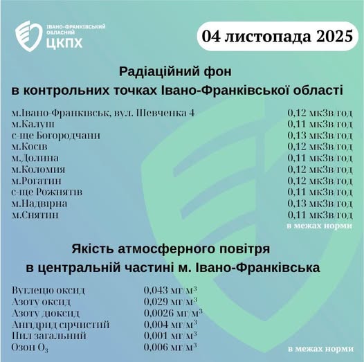 Станом на ранок 04.11.2025 показники радіаційного фону в Івано-Франківській області становлять від 0,11 мкЗв/год до 0,13 мкЗв/год, що не перевищує природний радіаційний фон характерний для Прикарпаття (0,32 мкЗв/год). Пише Голос-Інфо, […]