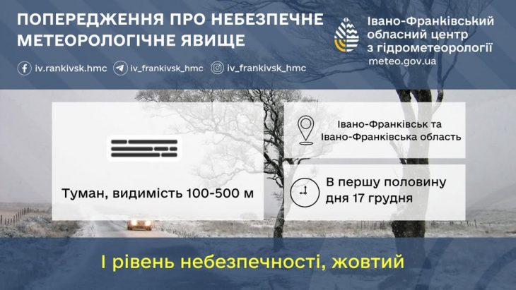 За повідомленням метеорологів, у першій половині дня 17 грудня по місту Івано-Франківську та області очікується сильний туман. Інформує Голос-Інфо, посилаючись на Івано-Франківський обласний центр з гідрометеорології Видимість 100–500 метрів. Рівень небезпечності 1-й […]