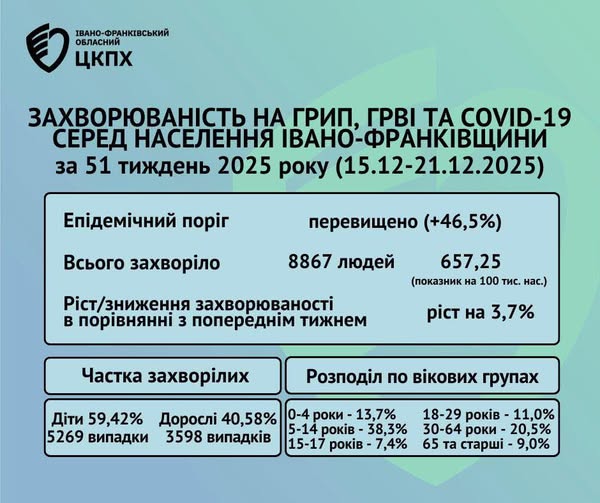 Згідно моніторингових досліджень, впродовж 51 тижня 2025 року (епідсезон 2025–2026 рр.) на ГРВІ, грип та COVID-19 захворіло 8867 особи, з них 5269 дітей віком 0-17 років (59,42%). Пише Голос-Інфо, посилаючись […]