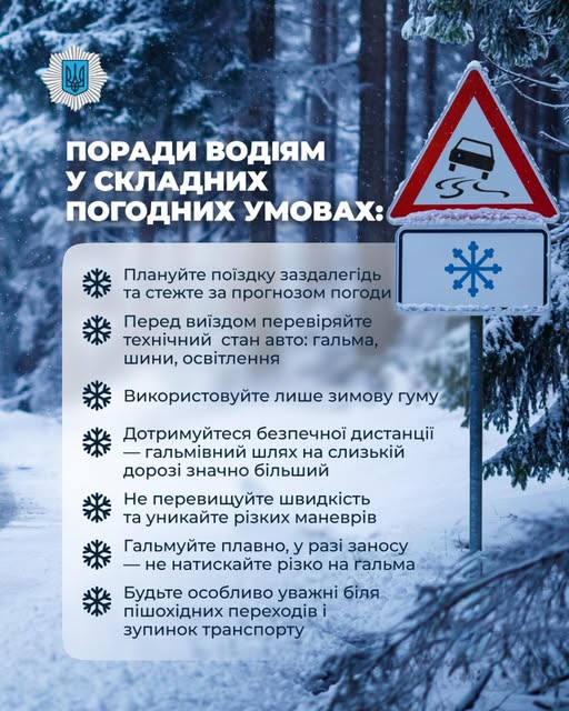 Зменшуйте швидкість, тримайте дистанцію та уникайте різких маневрів та завчасно гальмуйте перед пішохідними переходами. Пише Голос-Інфо, посилаючись на Поліцію Івано-Франківської області. Слідкуйте за видимістю й будьте уважні до дорожньої обстановки. […]