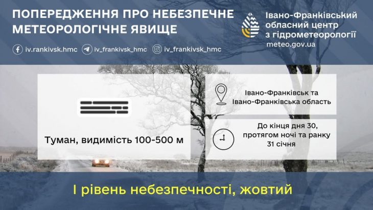 До кінця дня 30 січня, протягом ночі та ранку 31 січня по місту Івано-Франківську та області туман (видимість 100-500м) (1 рівень небезпечності, жовтий. Інформує Голос-Інфо, посилаючись на Івано-Франківський обласний центр […]