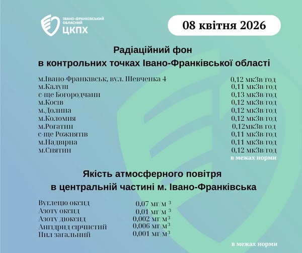 Станом на ранок 08.04.2026 показники радіаційного фону в Івано-Франківській області становлять від 0,11 мкЗв/год до 0,13 мкЗв/год, що не перевищує природний радіаційний фон характерний для Прикарпаття (0,32 мкЗв/год). Пише Голос-Інфо, […]