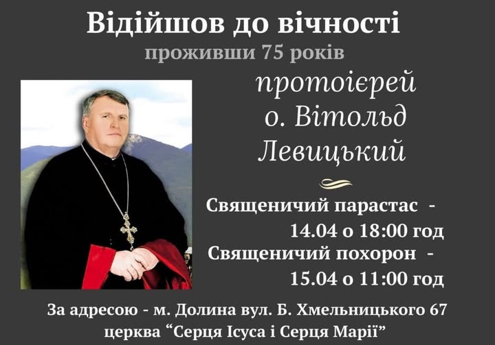 Із сумом повідомляємо, що на 76-му році життя та 33-му році священничого служіння упокоївся у Бозі душпастир Івано-Франківської Архієпархії УГКЦ — протоієрей Вітольд Левицький. Про це пише Голос-Інфо з посиланням […]