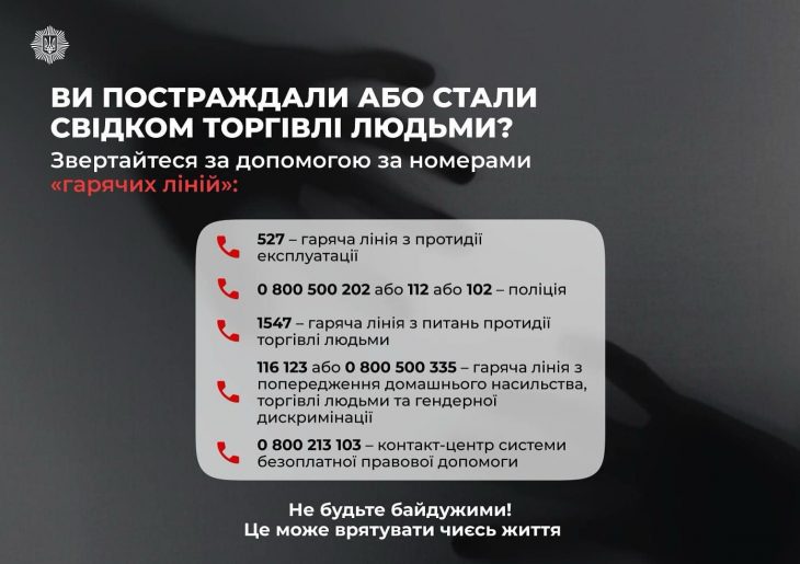 Якщо Ви або Ваші близькі потрапили до рук торгівців людьми, звертайтеся за допомогою за номерами «гарячих ліній»: