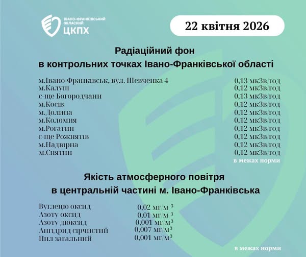 Відповідно до результатів моніторингових досліджень, проведених вранці 22 квітня 2026 року, екологічна ситуація в Івано-Франківській області залишається стабільною та безпечною для населення. Пише Голос-Інфо, посилаючись на Івано-Франківський обласний центр контролю […]