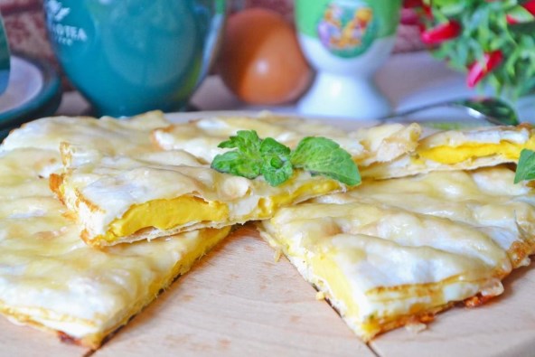 Наступний лаваш, ковбаса, сир і зверху накрити четвертим лавашем. Яйце, що залишилося, зверху розподіліть по лавашу, накрийте кришкою і поставте на плиту на слабкий вогонь. Через п’ять хвилин переверніть і знову накрийте кришкою, смажте ще п’ять хвилин.