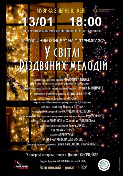 У вівторок, 13 січня, в Івано-Франківській обласній філармонії імені Іри Маланюк відбудеться благодійний концерт «У світлі різдвяних мелодій», у програмі якого прозвучать авторські твори о. Даниїла Сікори, ЧСВВ. Про це […]