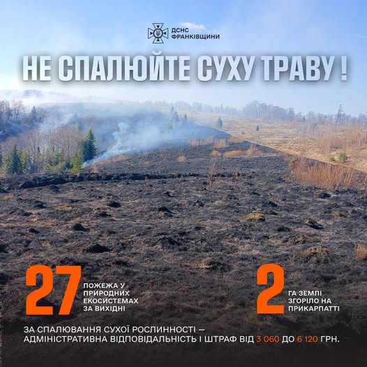 Впродовж вихідних прикарпатські вогнеборці ліквідували 27 пожеж в природних екосистемах на площі 2 га