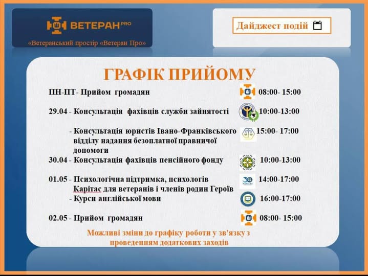 До відома ветеранів: графік подій в просторі “Ветеран ПРО” з 29.04.2025 по 02.05.2025