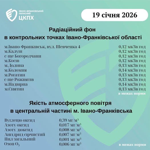Станом на ранок 19.01.2026 показники радіаційного фону в Івано-Франківській області становлять від 0,12 мкЗв/год до 0,14 мкЗв/год, що не перевищує природний радіаційний фон характерний для Прикарпаття (0,32 мкЗв/год).
