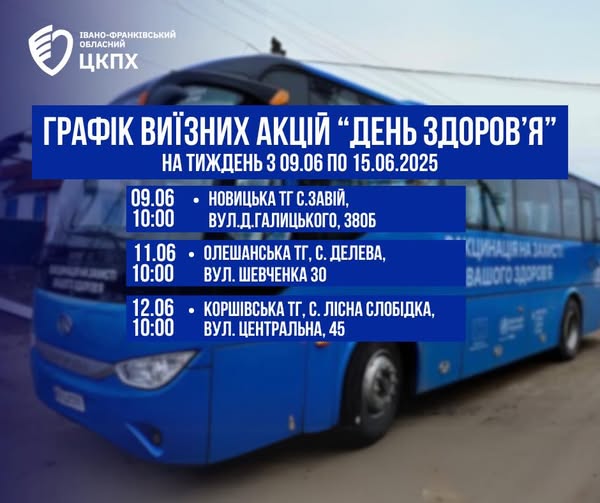 Графік виїзних акцій «День здоров’я» на тиждень з 09.06 по 15.06.2025 року