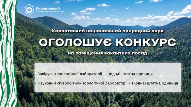 Карпатський національний природний парк (КНПП) запрошує науковців долучитися до збереження унікальної екосистеми регіону. Згідно з наказом №59 від 2026 року, установа оголошує конкурс на дві вакантні посади у зоологічній лабораторії.