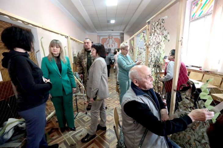 Перебуваючи із робочою поїздкою у Коломийській територіальній громаді, Людмила Сірко відвідала волонтерський центр, де проводилося плетіння маскувальних сіток» учасниками громадської організації «Нескорена нація».