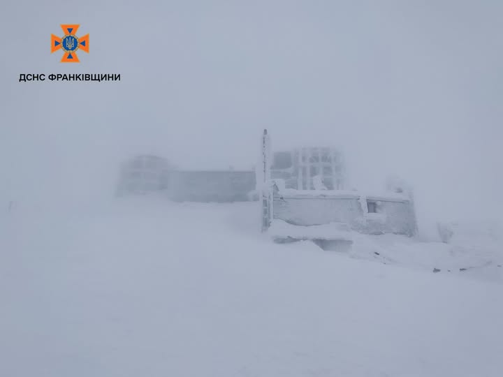 Станом на 09:05, 23.02.2026 на горі Піп Іван хмарно, сніг, обмежена видимість, вітер південно-східний, 15 м/с.