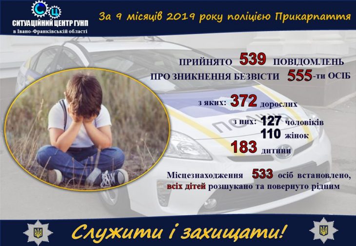 У поліції Івано-Франківської області оприлюднили інфографіку про безвісти зниклих людей за дев’ять місяців поточного року. Так, за цей час до поліції надійшло 539 повідомлень про зникнення 555-ти осіб. З яких: 372 дорослих, 127 чоловіків та 110 жінок. Від початку року зникло 183 дитини, яких було розшукано і повернуто рідним.