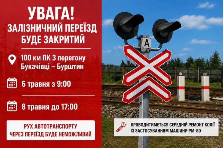 Бурштинська міська рада з посиланням на АТ «Укрзалізниця» (Івано-Франківська дистанція колії) попереджає про проведення планових ремонтних робіт, що спричинять тимчасове обмеження руху.