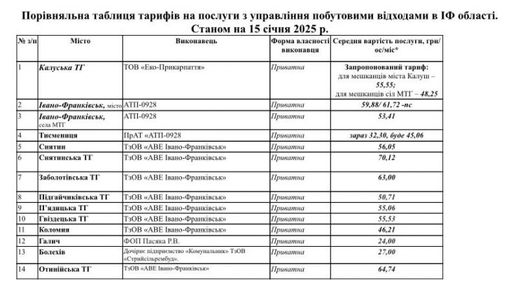 Для порівняння та кращого розуміння ситуації з тарифами на послуги з управління відходами в інших громадах, де їх надають приватні компанії, ТОВ «Еко-Прикарпаття» підготувало порівняльну таблицю.