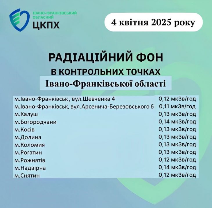 Станом на ранок 04.04.2025 показники радіаційного фону в Івано-Франківській області становлять від 0,11 мкЗв/год до 0,17 мкЗв/год (враховуючи допустиму похибку), що не перевищує природний радіаційний фон характерний для Прикарпаття (0,32 мкЗв/год).