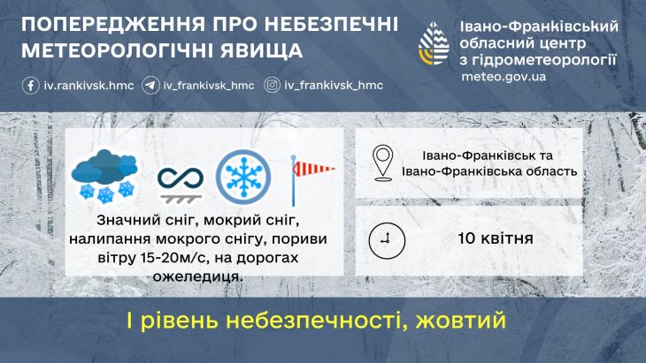 Протягом доби 10 квітня по м.Івано-Франківську та області значний сніг, мокрий сніг (15-49 мм за 12 год та менше), налипання мокрого снігу (11-34мм), пориви північно-західного вітру 15-20м/с, на дорогах ожеледиця.
