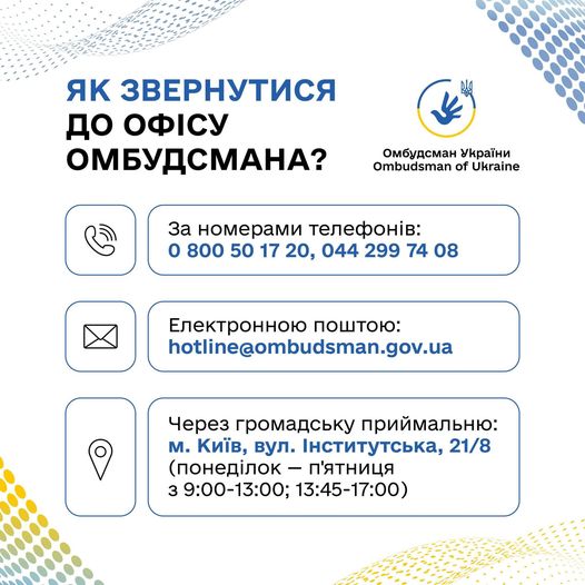– На електронну пошту: hotline@ombudsman.gov.ua.