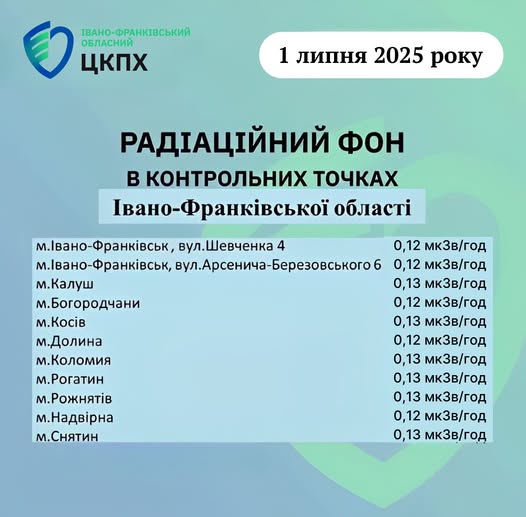 Станом на ранок 1 липня 2025 року показники радіаційного фону в Івано-Франківській області становлять від 0,12 мкЗв/год до 0,13 мкЗв/год.