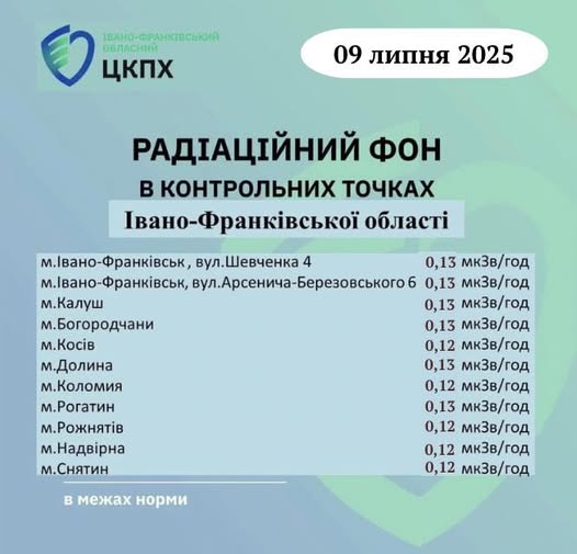 Станом на ранок 9 липня 2025 року, показники радіаційного фону в Івано-Франківській області коливаються від 0,12 мкЗв/год до 0,13 мкЗв/год. Ці значення не перевищують природний радіаційний фон, характерний для Прикарпаття, який становить 0,32 мкЗв/год.