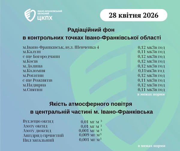 Станом на ранок 28.04.2026 показники радіаційного фону в Івано-Франківській області становлять від 0,11 мкЗв/год до 0,12 мкЗв/год, що не перевищує природний радіаційний фон характерний для Прикарпаття (0,32 мкЗв/год).