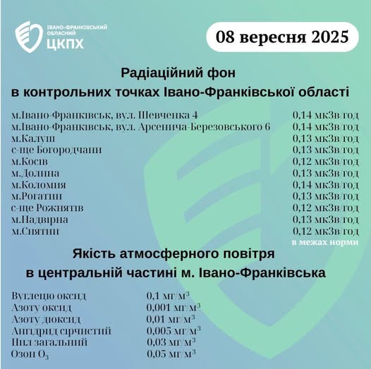 Станом на ранок 08.09.2025 показники радіаційного фону в Івано-Франківській області становлять від 0,12 мкЗв/год до 0,14 мкЗв/год, що не перевищує природний радіаційний фон характерний для Прикарпаття (0,32 мкЗв/год).